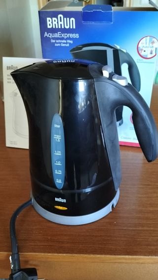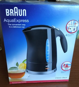 Hervidor de agua eléctrico de la marca Braun, modelo AquaExpress en color negro. - Capacidad máxima de 1.6 litros. - Sistema de seguridad de 4 vías. - Potencia de 3000 Watts para un rápido calentamiento. - Diseño Classic Black.