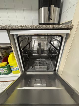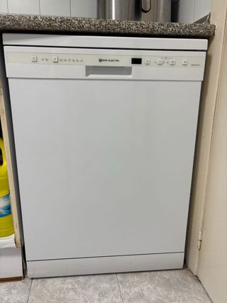 Lavavajillas EAS Electric EMD122W-V1 – Funciona perfectamente. Mantenido siempre con el depósito a tope de sal, para evitar la cal. ⚠️ Importante: le faltan las bandejas/cestas para platos y vasos. Solo incluye la cesta de los cubiertos, por lo que habría que comprar las bandejas si se quiere usar normalmente. Características: • Tamaño estándar. • Varios programas de lavado. • Panel digital. • Color blanco. • Interior de acero inoxidable.