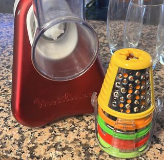 Rallador eléctrico con 3 Funciones en 1, 200 W, cortar en rodajas o cortar en tiras y rallar, 3 conos distintos, Plástico, Rojo/Blanco, solo un poco roto el plastico detras donde se mete cable. Funciona perfectamente