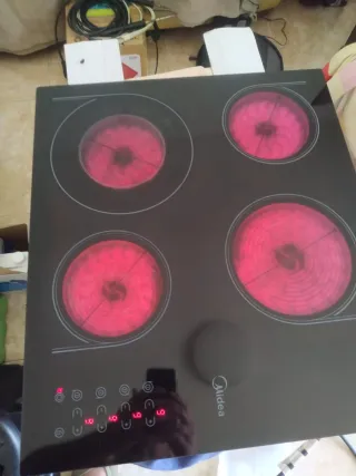 Placa vitrocerámica de la marca Midea con cuatro fuegos. - Diseño moderno en color negro. - Controles táctiles. - Indicadores de calor residual.
