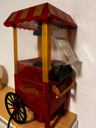 Preciosa máquina para palomitas, estilo carrito de cine clásico. Ideal para disfrutar de una película en casa. Funciona perfectamente, ha tenido poco uso. No dispongo de la caja - Diseño antiguo y encantador. - Color rojo y dorado. - Incluye una pequeña bandeja para servir.