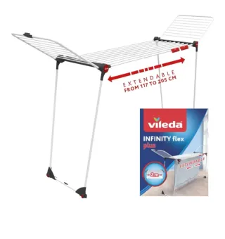 Tendedero extensible Vileda Infinity flex plus, ideal para optimizar el espacio. - Extensible de 117 a 205 cm. - Diseño plegable para un fácil almacenamiento. - Alas laterales para mayor capacidad de tendido.