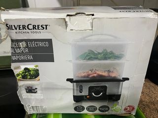 Cocedor eléctrico SilverCrest para cocinar al vapor. Ideal para preparar comidas saludables. - Capacidad de 3x3 L. - Potencia de 950 W. - Temporizador de hasta 75 minutos. - Libre de BPA.