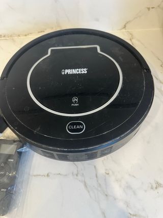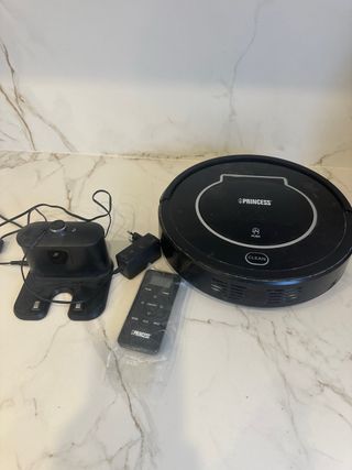 Aspirador automático de la marca Princess en color negro. Incluye su base de carga y mando a distancia. - Diseño redondo. - Base de carga. - Mando a distancia. Funciona perfectamente lo que se pierde y no suele volver a la base hay que llevarlo manualmente, tiene bastante uso