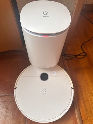 Robot aspirador Yeedi en color blanco. Diseñado para la limpieza automática de suelos. - Controlable mediante aplicación móvil. - Base de carga incluida.