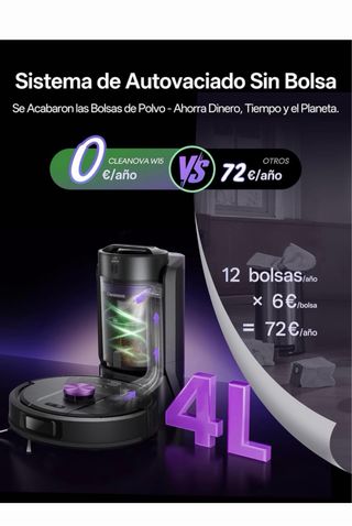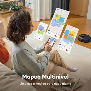 Sistema Spin: Incorpora mopas dobles giratorias de alta velocidad para eliminar manchas persistentes. Detección de alfombras: Eleva automáticamente las mopas para proteger las alfombras de la humedad. Tecnología: Cuenta con navegación láser, inteligencia artificial y control por aplicación móvil. Autovaciado: Incluye una base que vacía automáticamente el depósito de suciedad. SPIN UP: Eleva las mopas y protege las alfombras de la humedad.