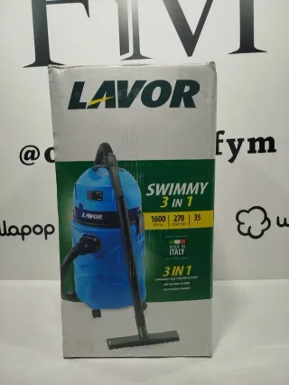 Aspirador Lavor Swimmy, ideal para la limpieza de piscinas y uso doméstico. Motor de 1600 vatios máx., depresión columna 27 kpa, caudal 70 l/s, deposito 20 litros, tarjeta electrónica para la parada/vaciado automática del aspirador Sistema de vaciado automático del depósito de agua 4 tubos de extensión de plástico para llegar al fondo de la piscina hasta 2 metros; el agua puede reutilizarse una vez que se han eliminado las impurezas. - Modelo: Swimmy - Potencia: 1600 W max - Presión: 270 mbar max - Capacidad: 35 litros - Fabricado en Italia