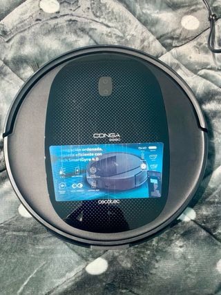 Robot aspirador de la marca Conga, modelo de Cecotec. Diseñado para la limpieza automática de suelos. - Color negro con acabado texturizado. - Incluye accesorio de mopa. - Botones de control táctiles en la parte superior.