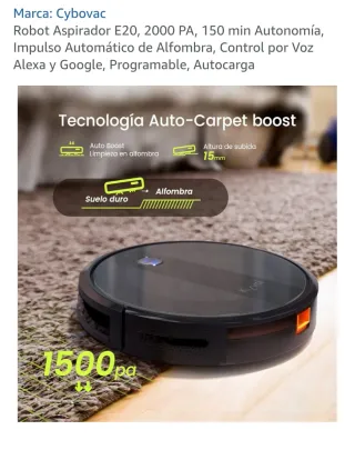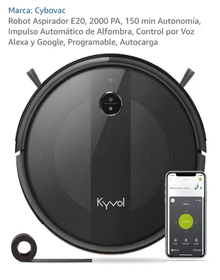 Robot aspirador Cybovac E20 en color negro. Diseñado para una limpieza eficiente del hogar. - Potencia de succión de 2000 PA. - Autonomía de 150 minutos. - Detección automática de alfombras. - Control por voz compatible con Alexa y Google. - Programable y con función de autocarga.