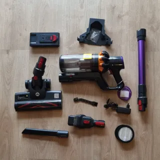 Aspiradora escoba de la marca Mauoke, ideal para la limpieza del hogar. Incluye varios accesorios para diferentes usos. - Cuerpo principal de la aspiradora. - Tubo de extensión morado. - Cabezal principal con cepillo. - Batería. - Base de carga. - Cargador de pared. - Filtro de repuesto. - Accesorio para ranuras. - Cepillo pequeño. Potente motor sin escobillas de 580W que ofrece hasta 45KPa de succión. 70 minutos de autonomía, 3 potencias diferentes y modo automático, luz led de color verde para ver mejor la suciedad y cepillo antienredos. Nueva a estrenar