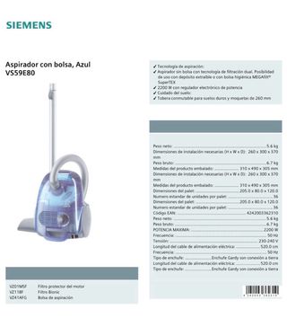 Aspirador Siemens de 2200W, modelo bag/bagless. Uso con depósito extraíble o bien con bolsa. - Diseño moderno en color azul. - Manguera flexible y tubo extensible. - Sistema parking (la escoba se ancla al cuerpo y queda en pie) - Recoge-cable automático