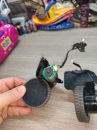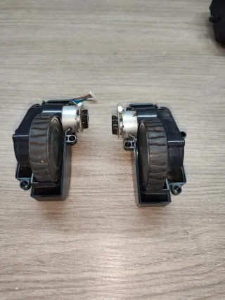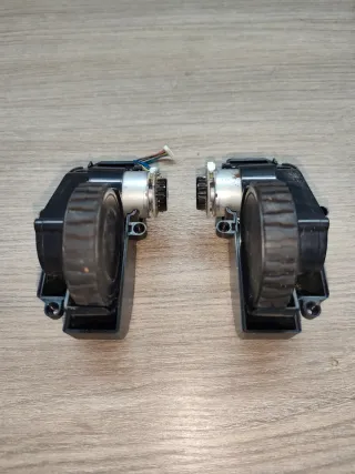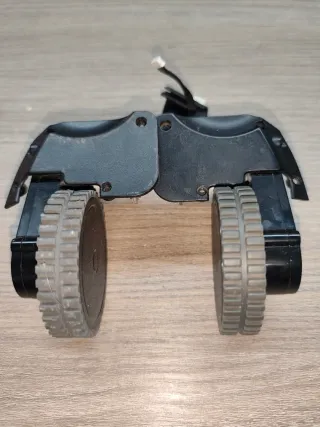 Conjunto de dos ruedas para robot aspirador. Incluye el módulo de motor y carcasa. Se vende conjunto o individual. - Color negro y gris. - Ruedas con banda de goma. - Cable de conexión incluido.