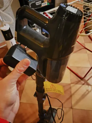 Aspiradora de mano y de escoba con accesorios. - Tubo de extensión. - Cepillo principal. - Cepillo para tapicerías. - Cepillo para ranuras. - Cargador. - Manual de instrucciones. La bateria no carga.