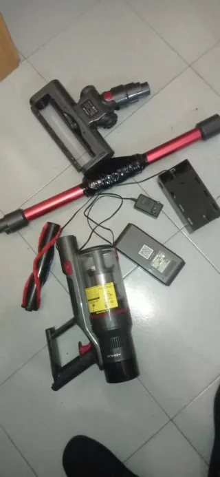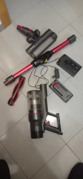 Aspiradora de mano y accesorios varios. - Tubo de extensión rojo. - Cepillo principal. - Base de carga. - Cargador de pared. - Batería. - Depósito de polvo. Funciona perfecta mente batería como nueva y dura mucho luces led en Cepillo I control de potencia es la de los afotos tal I como seve en fotos
