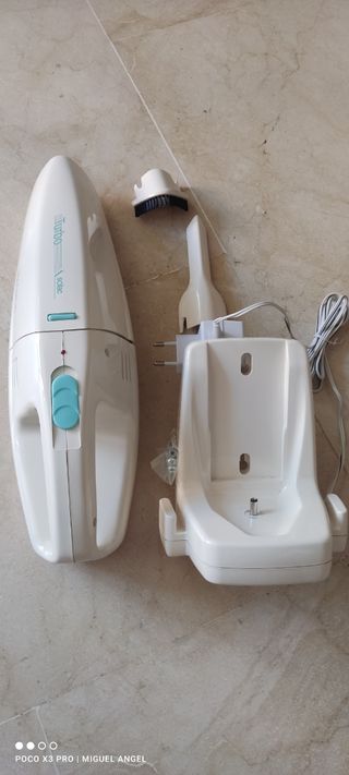 Aspiradora de mano MEIYOU, en buen estado. Incluye un cepillo. Es compacta y ligera. - Funciona con batería recargable. - Incluye cargador. Si quieres ver el modelo real que compré y sus caracteristicas, pon el dominio de amazon.es y seguidamente esto /dp/B08FX6C5YB