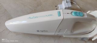 Aspirador de mano Solac Turbo AgrEvo, en buen estado. - Incluye aspirador, accesorio cepillo y base de carga. - Diseño compacto y ligero. - Color blanco y turquesa.