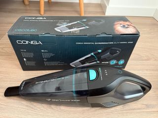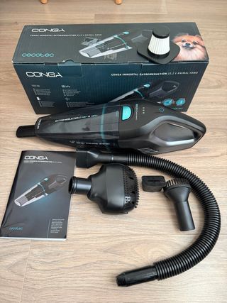 MUY POCOS USOS. Aspirador de mano "Cecotec Conga Immortal ExtremeSuction 22,2V Animal Hand". Muy potente, ideal para casas con mascotas y limpieza de coche. Es el modelo Wet & Dry: aspira sólidos y líquidos. Tecnología ciclónica con 25 min de autonomía. Incluye todos los accesorios de las fotos: - Cepillo especial mascotas. - Manguera flexible y 3 boquillas (esquinas/polvo). - Base de carga (apta para pared) y cargador. - Filtro extra y manual. Poco uso y en perfecto estado. Muy ligero y fácil de vaciar. Se entrega limpio y listo para usar.