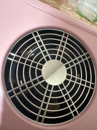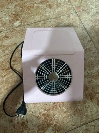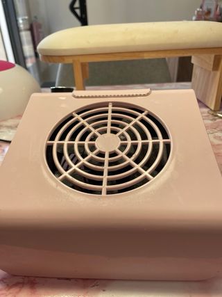 Aspirador de polvo para uñas en color rosa. Está en buen estado, aunque presenta algunas marcas de uso en la rejilla. - Recoge el polvo de uñas de forma eficiente. - Diseño compacto y fácil de usar. - Incluye cable de alimentación.