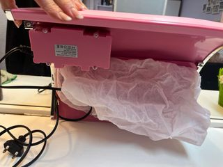 Aparato para recoger el polvo generado al limar las uñas. - Color rosa. - Incluye ventilador. - Adaptador de corriente.