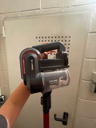 Aspiradora escoba de la marca Taurus, sin bolsa. - Color rojo y negro. - Incluye cargador y soporte de pared. funciona bien
