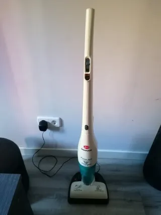 Aspirador escoba de la marca Hoover, color blanco y verde. - Diseño ligero y ergonómico. - Base de carga. - Cable de alimentación. Se acerca a domicilio en madrid sin coste Feidora y aspiradora por 15 euros, de mi perfil