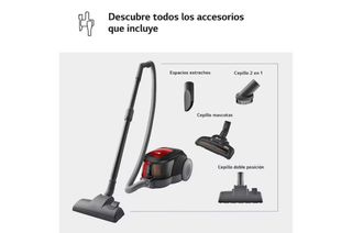 Aspiradora LG de 2000W con varios accesorios. - Incluye manguera flexible. - Tubo telescópico. - Cepillo principal. - Boquilla para rincones. - Cepillo pequeño.