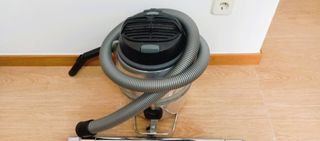 Aspiradora Nilfisk GS 80 Profesional con un diseño clásico y funcional. Ideal para diversas tareas de limpieza. - Cuerpo principal de metal pulido. - Asa superior para transporte. - Manguera flexible gris. - Cable de alimentación gris.