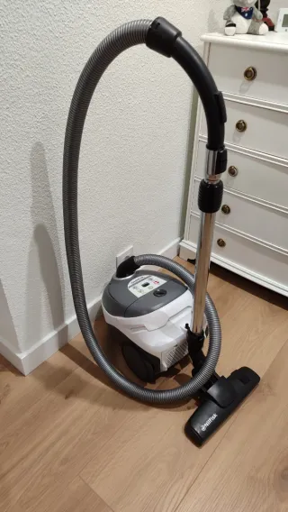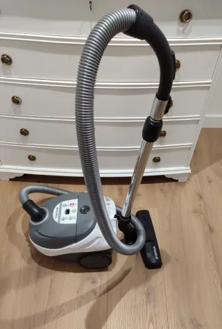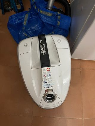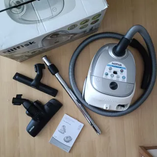 Aspirador Nilfisk Select. Usado, aunque funciona perfectamente. Tiene rota la palanca de apertura de la bolsa, pero no influye para su funcionamiento y se puede abrir fácilmente. Incluyo una paquete con las bolsas y filtros interiores (no HEPA) - Diseño moderno y compacto. - Color blanco y gris. - Incluye accesorios y bolsas.