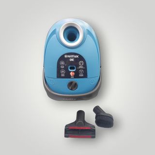 Aspirador Nilfisk ONE de color azul. Compacto y fácil de manejar. - Incluye manguera y tubo. - Cepillo principal. - Accesorio para ranuras. - 5 bolsas recambio nuevas