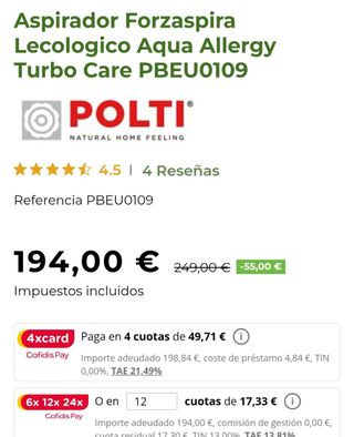 - Aspirador Sin Bolsa Polti Forzaspira Lecologico Aqua Allergy Natural Care - (dB):80db Información adicional:Aspiradora sin bolsa con filtro de agua, ideal para quien sufre de alergias. La acción combinada del filtro de agua y del filtro HEPA retienen hasta las partículas más pequeñas de polvo, los ácaros y los alérgenos, devolviendo al ambiente un aire más limpio. El Forzaspira Lecologico Aqua Allergy Natural Care no tiene bolsa y permite aspirar tanto sólidos como líquidos, la fuerza de aspiración es regulable a 4 velocidades. - Regalo Mochila Para Guardar Accesorios