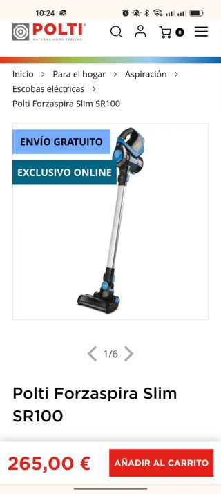 Aspiradora Polti Vaporetto FAV80 con depósito de agua. Aspira muy bien, tiene bastantes modos ya que funciona también como vaporeta. El único problema que tiene es que el botón de start para que empiece a aspirar, a veces se atasca y hay que darle varias veces para que empiece. Por lo demás funciona bastante bien. Un poco sucia de polvo pero con limpiarla queda como nueva. Viene con el accesorio del palo para que sea más larga, funciona bien. En la página web de polti cuesta 800€