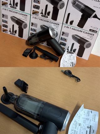 Aspiradora multifunción portátil, ideal para limpiar pequeños espacios. Incluye varios accesorios. Está en buen estado y lista para usar. - Diseño compacto y ligero. - Incluye diferentes boquillas para distintas superficies. - Fácil de usar y limpiar. - Perfecta para el hogar, el coche o la oficina.