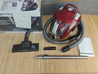 Aspiradora Rowenta Tonixo de color rojo y gris en perfecto estado. Cuenta con un diseño compacto y un asa para facilitar su transporte. - Potencia de 1350W. - Sistema Delta System. - 28 kPa de potencia de succión.