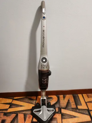 Aspirador escoba de la marca Rowenta, modelo Air Force. Buen estado. Incluye cargador. Autonomía de 35 minutos. - Color: Dorado/Gris. - Voltaje: 12V. - Sistema No Bag (sin bolsa). - 2 velocidades. - Diseño ligero y ergonómico. - Llega a cualquier parte y recoge todo, gracias a su forma triangular.