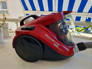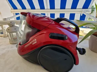 Aspirador Rowenta de color rojo, modelo Compact Power. - Tiene cepillo y tubo aunque no aparece en las fotos. - Diseño compacto y ligero. - Asa para facilitar el transporte. - Depósito transparente.
