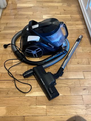 Aspirador de la marca Rowenta en color azul. - Incluye tubo, palo telescopio y dos cepillo. - Diseño compacto y moderno. El motor funciona correctamente, el tubo está roto y hay que cambiarlo para que succione correctamente Se suministra con tres bolsas de recogida compatibles