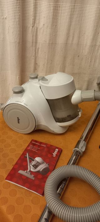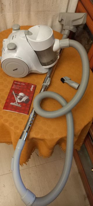 Aspiradora UFESA modelo ACTIVA, sin bolsa, filtro Hepa. Tubo regulable de longitud. En muy buen estado. Apenas usada porque tengo otra. - Aspiradora compacta y ligera. - Diseño moderno y elegante en color blanco. - Incluye manual de instrucciones.