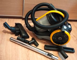 Aspirador ciclónico sin bolsa. Cepillo universal 2 posiciones, cepillo para parquet incluido, filtro HEPA y kit de aspiración de superficies pequeñas ( lanza de aspiración 2 en 1 y boquilla de aspiración ) y tubo telescópico. Potencia regulable, 800W. Depósito de 2L, recogecables automático.