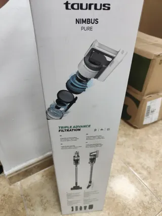 Aspiradora sin cable Taurus Nimbus Pure. - Potencia de 165W. - Sistema ciclónico turbo. - Incluye dos cepillos: All Road y Fuzzy. - Autonomía de 33.6V MAX. - Succión de 12.500 Pa.