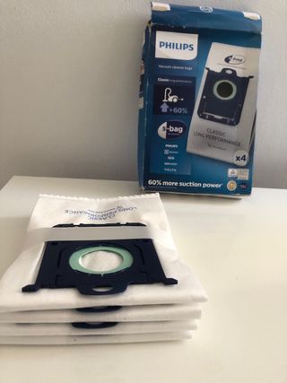 Bolsas para aspiradora Philips nuevas. Ideales para mantener tu aspiradora funcionando al máximo. - 4 bolsas S-bag Classic de alto rendimiento para aspiradoras Philips, AEG, Tornado y Volta. - Compatibles con varios modelos. - Ofrecen un 60% más de potencia de succión (comparado con bolsas Philips FC8019/01). - Bolsas en su caja original, impecables.