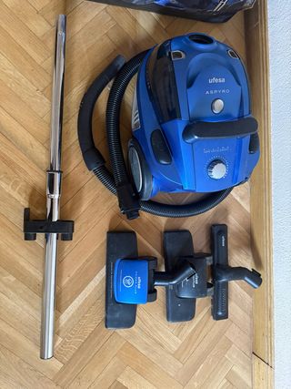 Aspirador Ufesa Aspiro en color azul, con varios accesorios para una limpieza completa. - Tubo telescópico metálico. - Manguera flexible. - Cepillo principal. - Cepillo para tapicerías. - Boquilla estrecha. Precio negociable
