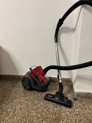 Aspiradora Ufesa Cyclotron en color rojo y plateado. - Diseño sin bolsa. - Manguera flexible. - Tubo extensible.