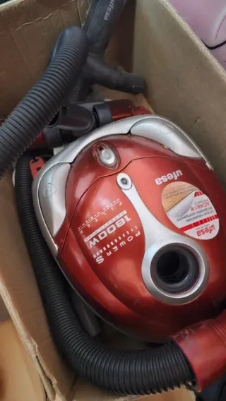 Aspiradora Ufesa Selecta en buen estado, lista para usar. Incluye varios accesorios para diferentes tipos de limpieza. En muy buen estado y funcionnado perfectamente, pero se le rompio el asa de transportarla