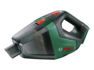 Aspiradora de mano compacta y ligera de la marca Bosch. Incluye el cargador y la batería sin uso. - Diseño ergonómico en color verde y negro. - Asa con agarre texturizado. - Botón de encendido/apagado rojo. - Depósito transparente para ver el nivel de suciedad.