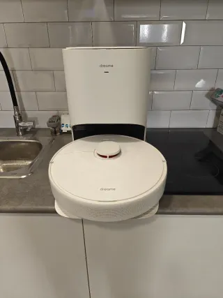 Robot aspirador de la marca Dreame. Diseño moderno y funcional. - Color blanco. - Base de carga incluida.