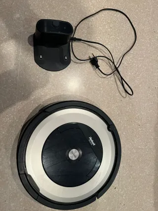 Robot aspirador Roomba en color negro y blanco. Se encuentra en su base de carga con luz verde encendida. - Modelo Roomba. - Base de carga incluida.