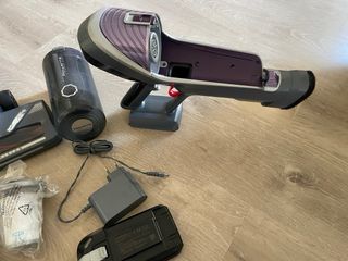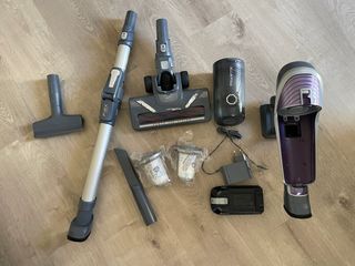 Aspirador escoba Rowenta X-Force Flex 8.60 en color morado y gris. No llega a 3 años que la compramos, a penas sin uso al estar en segunda residencia. Funciona perfectamente, se puede probar. - Tubo flexible para debajo sofá y muebles. - Cargador. - Batería. - Cepillo motorizado Power Led Vision. - Dos filtros NUEVOS lavables. - Accesorio para ranuras. - Accesorio para tapicerías y colchones. Tiene dos potencias, la normal y la de máxima potencia.