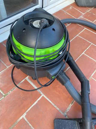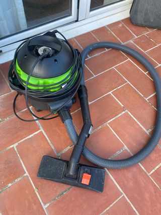 Aspiradora con cable de color negro y verde, ideal para la limpieza. Tiene su uso pero aspira bien . - Manguera flexible. - Cabezal de aspiración. - Cable de alimentación enrollado.