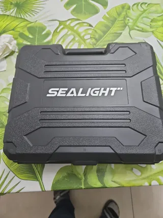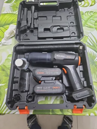 Aspirador portátil Sealight en color negro y naranja, con varios accesorios para su uso. - Incluye dos baterías de litio YHL5115. - Viene con un tubo flexible y diferentes boquillas. - Se presenta en un maletín de transporte.