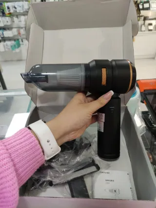 Este mini aspirador tiene un diseño elegante en color negro con detalles dorados. - Incluye varios accesorios para diferentes usos. - Compacto y fácil de manejar.